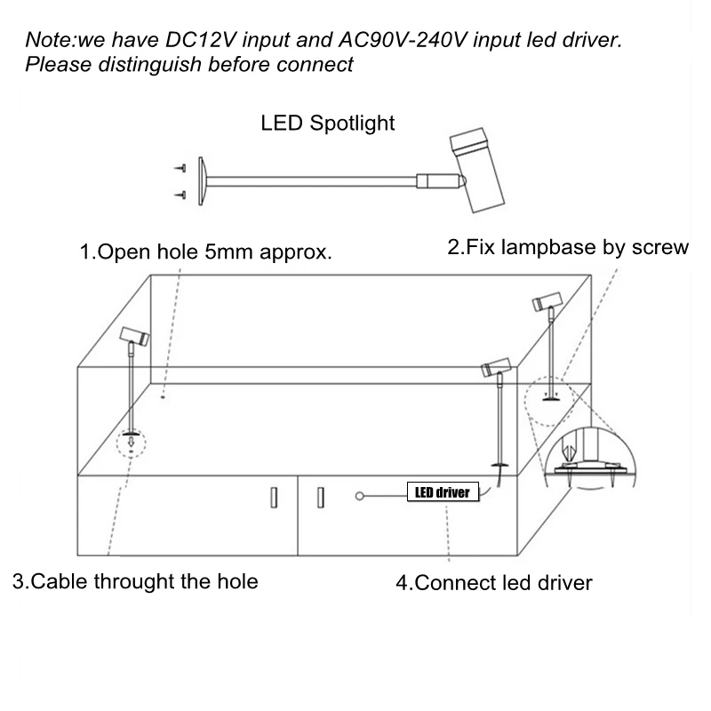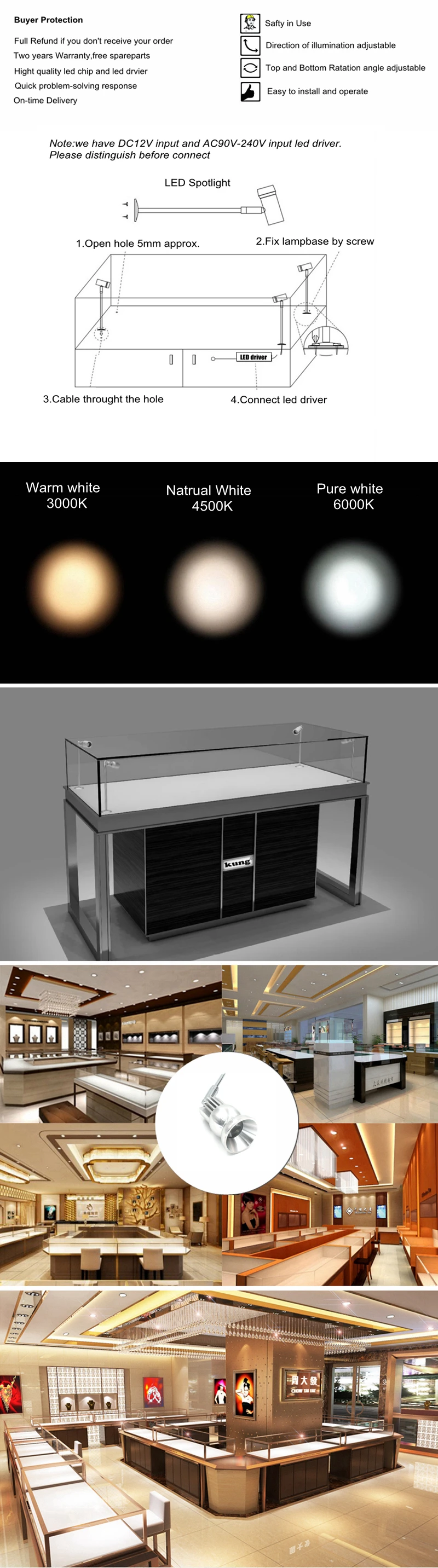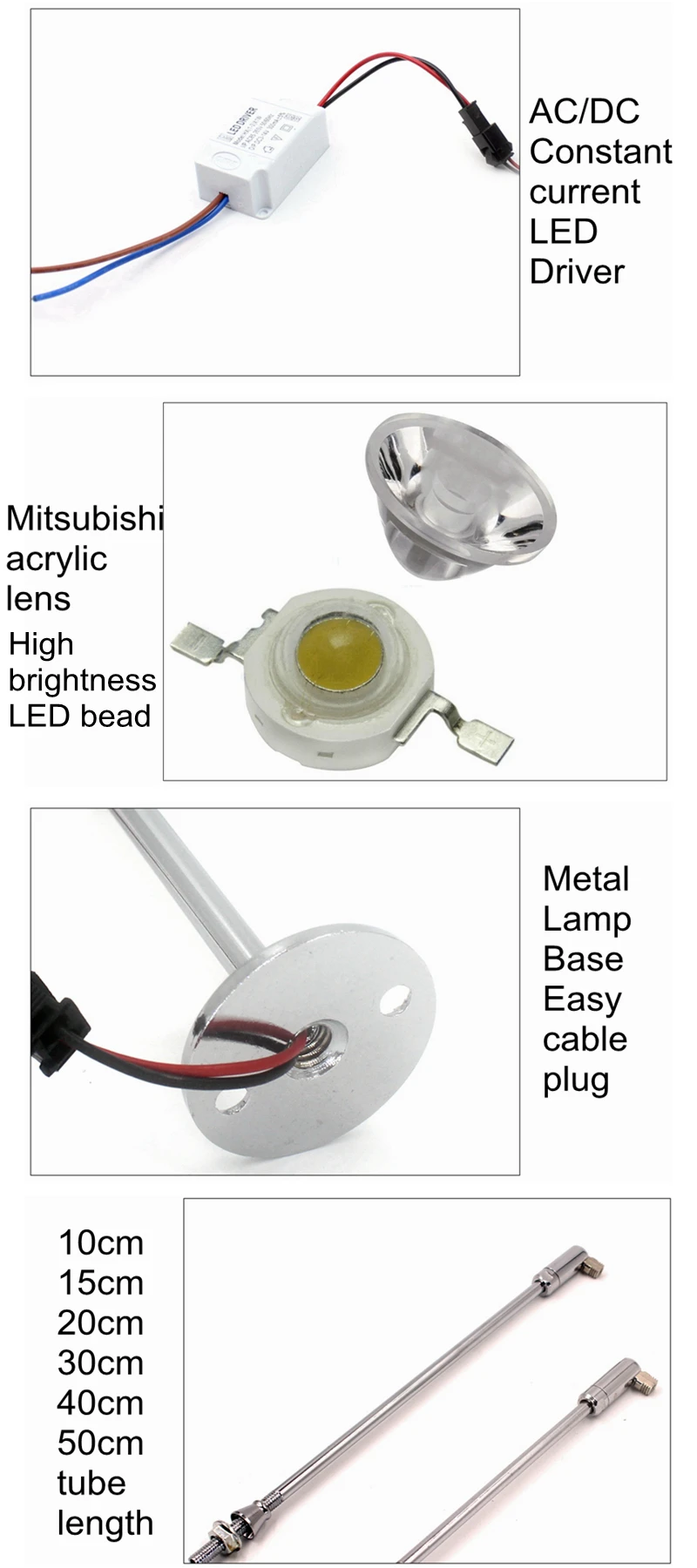 One combo 4PCS DC12V input 1W chrome color aluminum body warm white 3000K natural white 4000K pure white 6000K red green blue yellow color led spotlight tube length 20cm/30cm LED spot lamp with constant current DC12V input led driver for showcase cabinet
